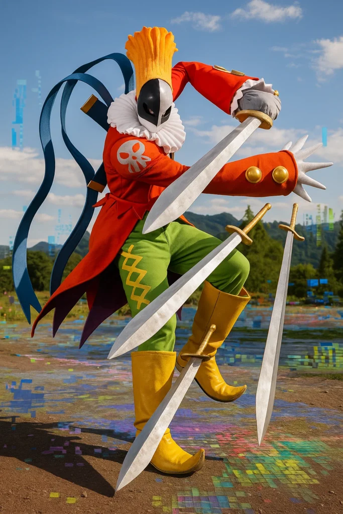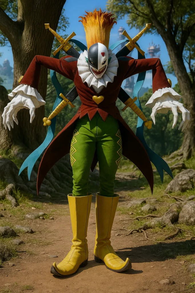- Pañuelos Problema (Trump Swords): Lanza un aluvión de espadas afiladas desde sus mangas.